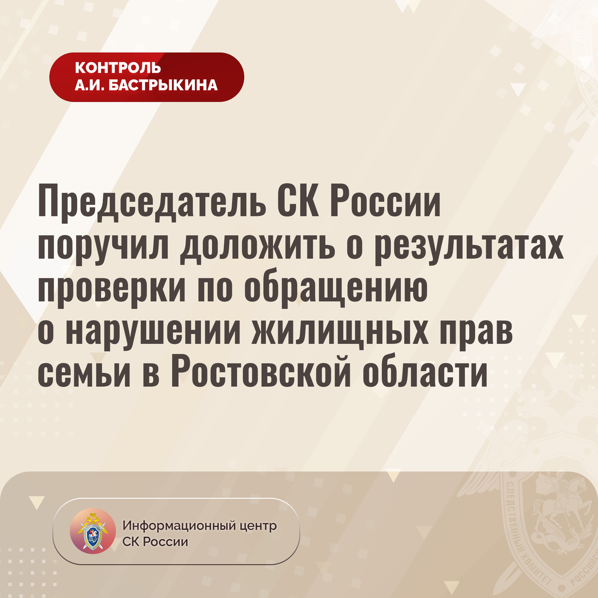 Председатель СК России поручил доложить о результатах проверки по обращению о нарушении жилищных прав семьи в Ростовской области В комментариях в аккаунте Информационного центра СК России «ВКонтакте» размещено обращение жительницы Ростовской области по вопросу нарушения прав ее семьи. Женщина, воспитывающая двух малолетних детей-инвалидов, с 2017 года состоит на учете лиц, нуждающихся в обеспечении жилым помещением. В июне текущего года суд обязал предоставить гражданам благоустроенное жилье во внеочередном порядке. Однако до настоящего времени судебное решение не исполнено. Обращения в компетентные органы результатов не принесли. В СУ СК России по Ростовской области организована процессуальная проверка. Председатель Следственного комитета Российской Федерации Александр Иванович Бастрыкин поручил руководителю СУ СК России по Ростовской области Аслану Гаруновичу Хуаде доложить о предварительных и окончательных результатах процессуальной проверки. Исполнение поручения, а также ход процес