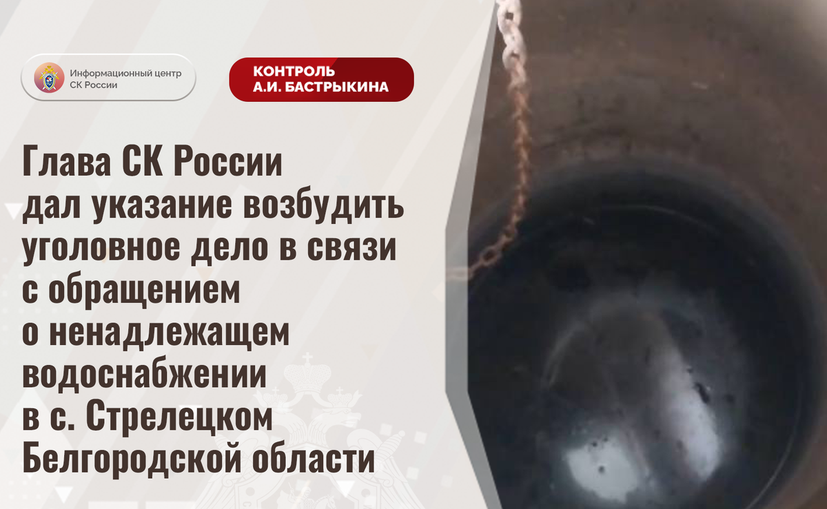 Глава СК России дал указание возбудить уголовное дело в связи с обращением о ненадлежащем водоснабжении в с. Стрелецком Белгородской области В комментариях в аккаунте приёмной Председателя СК России А.И. Бастрыкина в социальной сети «ВКонтакте» поступило обращение по вопросу нарушения прав жителей села Стрелецкое Белгородской области. В связи с отсутствием в населенном пункте централизованного водоснабжения граждане вынуждены осуществлять забор необходимого ресурса из скважин. При этом из-за регулярных отключений электроэнергии подача воды прекращается, единственным источником в указанные периоды является местный ветхий колодец, вода в котором непригодна для потребления и бытовых нужд из-за наличия токсичных примесей. Обращения жителей различные инстанции результатов не принесли. Указанная ситуация освещалась в социальной сети. В СУ СК России по Белгородской области организована процессуальная проверка. Председатель Следственного комитета Российской Федерации Александр Иванович Бастрык