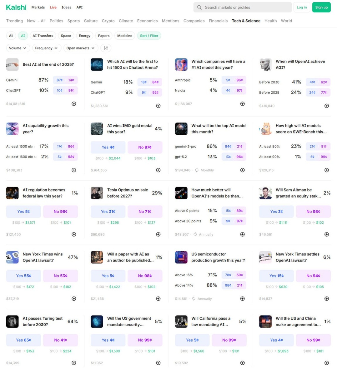 Хотели бы знать будущее? Что будет через неделю, месяц... 5 лет. Возможно, с вашим стартапом. Я вот иногда бы хотел. И на этом желании разработчики Kalshi сделали бизнес. Там люди делают ставки на то, что произойдет в будущем. Например, «Поднимется ли курс биткоина до $130 тысяч?», «Будет ли легализована марихуана в США?», «Уйдет ли Трамп в отставку в этом году?» - и все это легально, биржа зарегистрирована и регулируется Комиссией по торговле фьючерсами США. Есть даже раздел с ИИ. Интересно покопаться, чтобы узнать, что люди ждут от этой технологии. Если кликнуть на сам «актив», можно посмотреть на графике, как менялись их ожидания со временем. Например, лучшей нейросетью в 2025 году считают Gemini (87%), второе место у ChatGPT (10%), Grok (6%) на третьем. Лучшая модель по версии пользователей — тоже Gemini-3-pro (86%), второе место у GPT-5.2 (13%). ИИ вообще интригует: 41% считают, что OpenAI получит AGI (машина на уровне человеческого разума) до 2030, а 64% надеются, что ИИ прой