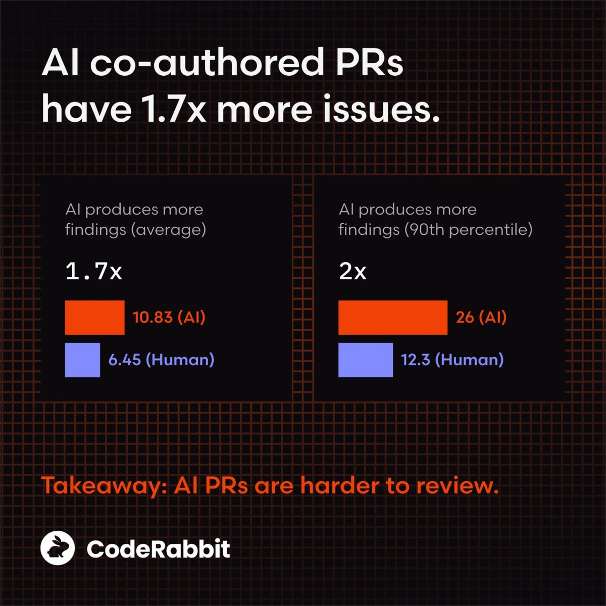 CodeRabbit проанализировали сотни PR в опенсорсе (сравнили чисто человеческие и AI-ассистированные) и выкатили отчет, результаты такие: 1️⃣ Количество багов выше в 1.7 раза. В среднем, AI-генерируемый код приносит на 70% больше проблем, чем написанный кожаным мешком. Причем речь не о мелких опечатках, а о критических уязвимостях. 2️⃣ Читаемость кода хуже в 3 раза. Нейронки генерируют синтаксически верный, но абсолютно "пластиковый" код. Он выглядит нормально издалека, но нарушает локальные конвенции, нейминг и структуру. Читать это через полгода будет больно. 3️⃣Ошибки в бизнес-логике (+75%). AI не понимает ваш бизнес. Он понимает статистическую вероятность следующего токена. В итоге мы получаем код, который запускается и работает, но делает не то, что нужно. 4️⃣ Дыры в безопасности (x2.7). Хардкод паролей, небезопасные прямые ссылки на объекты, игнорирование санитайзинга данных. Нейронки радостно тащат в продакшен легаси-паттерны десятилетней давности, на которых они обучались. �