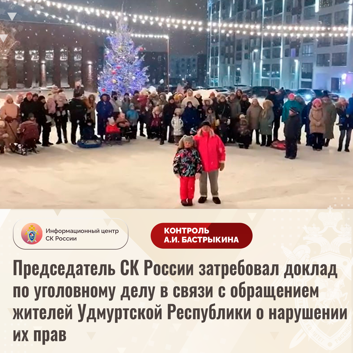 Председатель СК России затребовал доклад по уголовному делу в связи с обращением жителей Удмуртской Республики о нарушении их прав В СМИ и социальной сети размещено видеообращение жителей села Первомайского Удмуртской Республики по вопросу нарушения их прав. В населенном пункте возведено несколько жилых комплексов. Однако в селе отсутствуют объекты социальной инфраструктуры, в том числе школы, детские сады и поликлиника. Несовершеннолетние вынуждены посещать учреждения, расположенные в соседних районах. Обращения местных жителей в различные инстанции результатов не принесли. В СУ СК России по Удмуртской Республике возбуждено уголовное дело. Председатель Следственного комитета Российской Федерации Александр Иванович Бастрыкин затребовал у руководителя СУ СК России по Удмуртской Республике Рустама Рашидовича Тугушева доклад о предварительных и окончательных результатах расследования уголовного дела. Исполнение поручения поставлено на контроль в центральном аппарате ведомства. #Следственн