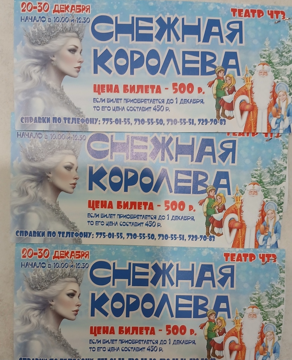 Теперь мы дважды сходим на «Снежную королеву»: от соседа — в местный ДК, и в челябинский бизнес‑центр (билеты туда мы уже давно купили). Устроим сравнительный анализ постановок. Кто знает, может, одна Снежная королева окажется чуть более снежной, чем другая?