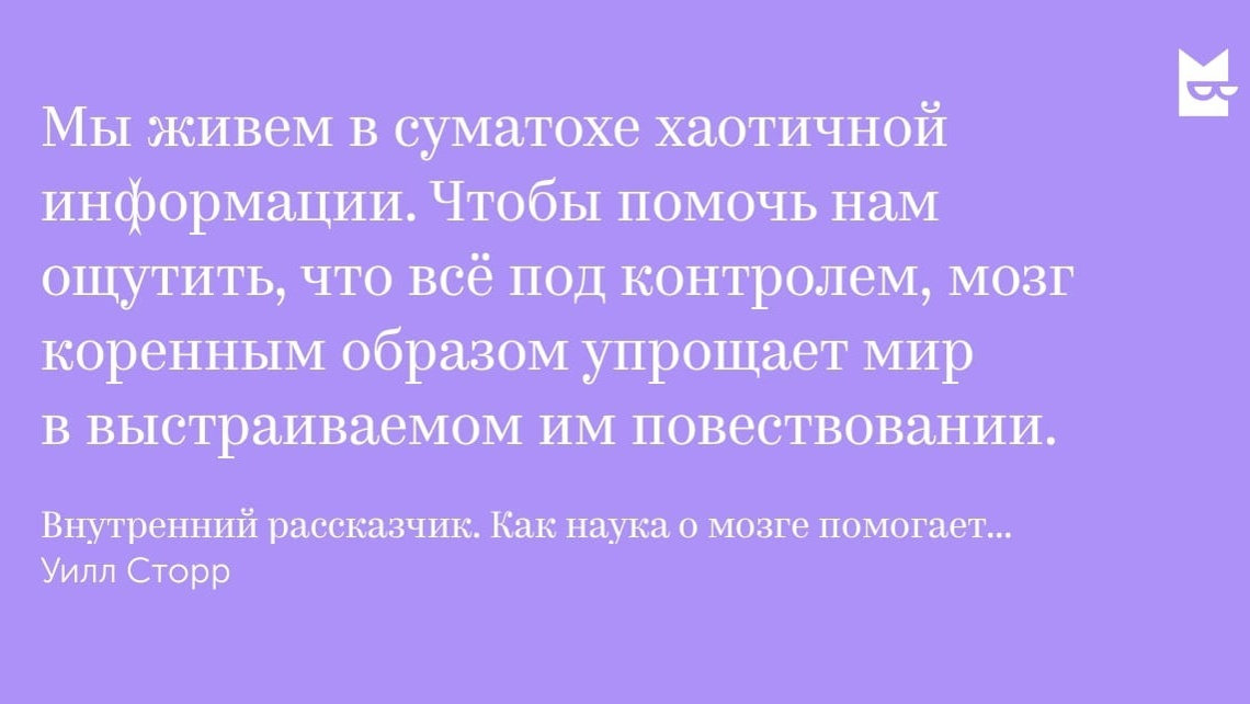 Рекомендация практикующего врача-психотерапевта книги Уилла Сторра (Individuum, 2024) с ключевыми цитатами Знакомясь с книгой Уилла Сторра, известного писателя и журналиста, вас неизбежно затянет в увлекательное путешествие по разуму человека! В ней вы узнаете, почему мозг мыслит историями, как и почему каждый из нас изобретает свою глобальную историю - модель реальности. Как эта история зачастую вводит нас в заблуждение и заставляет отчаянно не понимать других? Автор опирается на авангардные знания в нейробиологии и психологической науке, что здорово помогает читателю мыслить самому в ногу со временем о себе, людях, о культуре и об искусстве. Несмотря на то, что книга может показаться специализированной и адресованной сценаристам и писателям, ее мы рекомендуем нашим клиентам в ходе индивидуальной терапии, чтобы они могли наладить лучший контакт с реальностью, избавиться от глобальных искажений и точнее понимать себя и других. Я выбрала для вас ключевые идеи, забирайте их и по