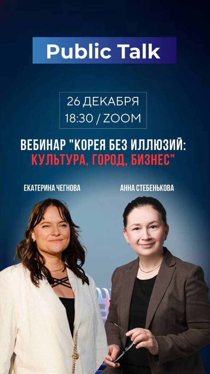 ”. Потому что в Корее смысл часто живёт не в словах, а в контексте, статусе, тоне и паузах. Если вы учите языки, планируете поездку или просто хотите понимать Корею глубже, чем дорамы и туристический маршрут — приходите на бесплатный вебинар: «Корея без иллюзий: культура, город, бизнес» 📍 26 декабря • 18:30 • Zoom язык: русский • бесплатно по регистрации Что будет: — как устроены культурные коды (и почему из-за них люди “не сходятся” даже при хорошем английском) — Сеул: что стоит увидеть, чтобы почувствовать ритм и логику города — 5 типовых ошибок иностранцев в деловом/повседневном общении (чтобы не попадать в неловкие ситуации) 🎤 Ведут: Анна Стебенькова Бизнес-консультант, эксперт по межкультурной коммуникации, переговорам и бизнес-этикету со странами Востока. Бизнес-тренер (IIMD), спикер Сколково и ведущих бизнес-форумов. Почётный гражданин Сеула. Екатерина Чегнова Со-основатель международного проекта Public Talk и Star Talk Language School TEDx-спикер и куратор TEDxNU Доцен