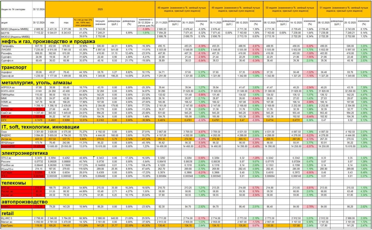 Какие акции в портфелях и почему Красным выделил акции, % изменения лучше IMOEX, зелёным хуже Ярко красным выделил компании, фундамент которых считаю опасным Выложил только лидеров недели С 1 декабря IMOEX +2.6% портфель +3.1% Держу в портфелях акции с сильными трендами и фундаменталом Лидеры Лукойл Озон Яндекс КЦ ИКС 5 ГМК НорНикель Полюс Россети РСетиЛЭ-п РсетВол Евротранс Ростелеком Лучшие сектора недели Телекомы Металлурги Электрогенерация Аутсайдеры недели Банки Подчеркнул акции в портфеле Из лидеров недели, 4 Из аутсайдеров, 0 4 из 8 акций в портфеле - лидеры недели. Думаю, не плохо Удобно, когда единая таблица EXCEL с фундаменталом по годам, анализом трендов и портфелями в % по каждой акции Понятна логика Портфели на фонде, все действия и причины принятия решений А также ФОРТС: сделки, скрипты, алгоритмы https://t.me/OlegTrading_Bot