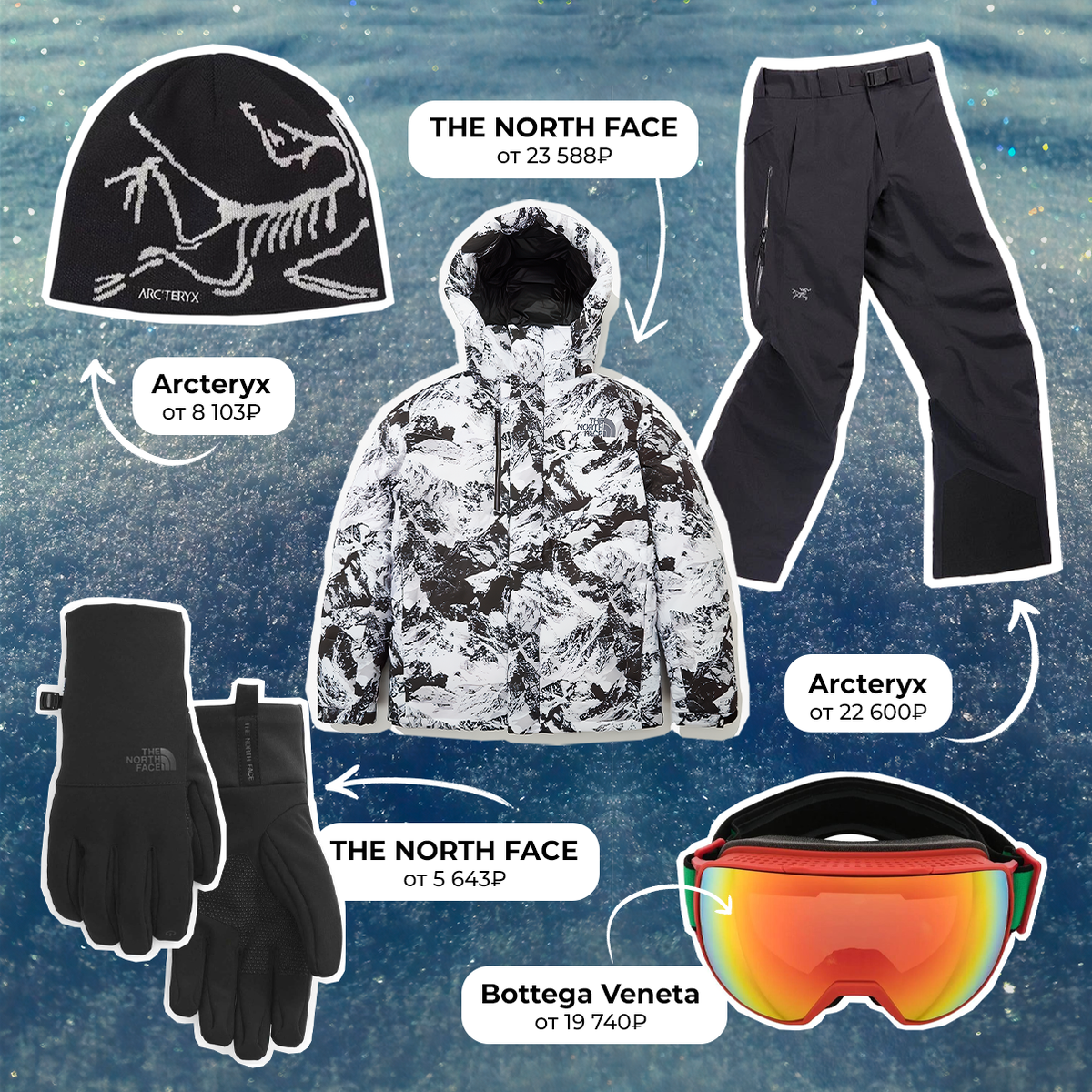Знаем, что вы уже достали свои сноуборды и лыжи, так что пора подбирать к ним аутфит. Если что, то мы уже это сделали. THE NORTH FACE, цена от 5 643₽* Arcteryx, цена от 8 103₽* Bottega Veneta, цена от 19 740₽* Arcteryx, цена от 22 600₽* THE NORTH FACE, цена от 23 588₽* *стоимость может изменяться в зависимости от курса и размера Больше интересного на нашем сайте POIZON