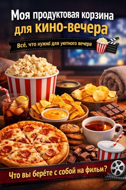 Иногда лучший отдых - это просто включить фильм и никуда не спешить. Без гостей, готовки и сложных планов. Для такого вечера у меня есть простая продуктовая корзина - все, что можно есть легко и не отвлекаться от экрана.