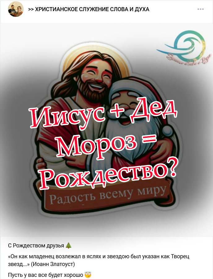 🎅 В одном из сообществ появилась открытка, вызвавшая бурную реакцию: Иисус Христос обнимает Деда Мороза. Подпись гласила: "Радость всему миру". Когда одна из женщин спросила, какое отношение сказочный персонаж имеет к рождению Спасителя, последовал неожиданный ответ. Авторы поста заявили, что на картинке вовсе не Дед Мороз, а святой Николай Чудотворец, который… "работает на Иисуса Христа". А всем несогласным посоветовали включить чувство юмора, ведь даже у великих реформаторов оно было. Давайте разберёмся, почему такой подход — это не просто безобидная праздничная шутка, а опасная игра с самым главным. Первый трюк в этом ответе — подмена понятий.