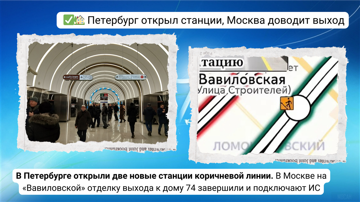 официальные отчеты. Давайте вместе разберемся, что же на самом деле происходит с нашей Москвой. Поехали? В первой части хотим рассказать о том, что в Санкт-Петербурге открыли 2 новые станции метро "Путиловская" и "Юго-Западная" на новой Коричневой линии. На входном павильоне 🚇 станции «Вавиловская» 🏡Троицкой линии смонтированы элементы цифровой навигации, камеры, подключили букву «М». Завершено остекление, установлены двери. Перенесено ограждение стройплощадки перед входом. Внутри монтируются инженерные системы. Перед входом уложена плитка. ------------