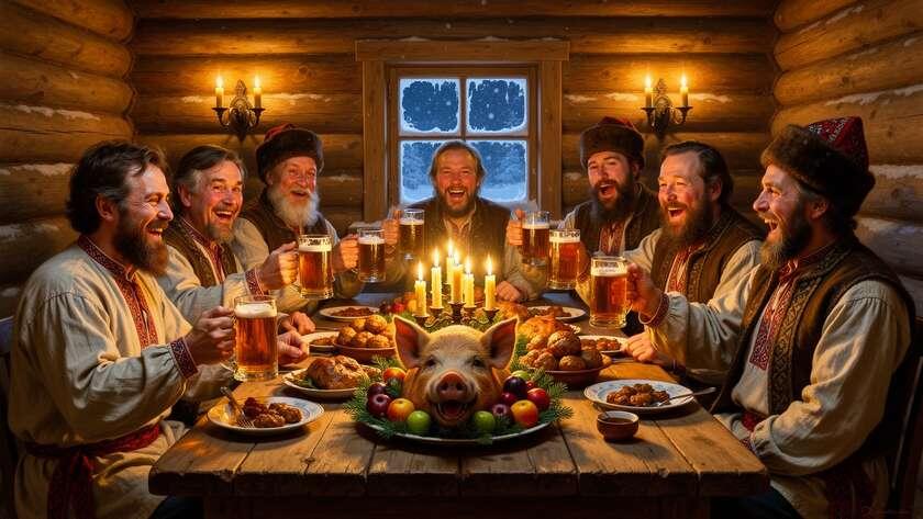 Это было главное время для гаданий на будущее. Существовало поверье: «Как Новый год встретишь, так его и проведешь». Поэтому стол должен был ломиться от еды. Обязательным блюдом был жареный поросенок (символ плодородия) или блюда из свинины. А вот птицу, зайца или рыбу есть остерегались — «счастье улетит или уплывет». ✅ Раздать ВСЕ долги. Это железное правило. В новый год нужно входить чистым.