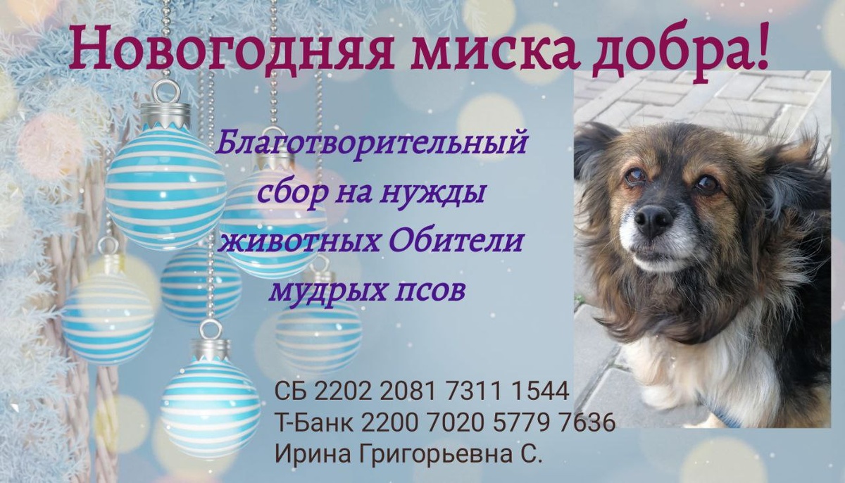 !"🤗 Это благотворительный сбор на нужды животных Обители мудрых псов (покупка корма, лекарств, вакцин, обработок, оплата лечения и др.). С вашей помощью в прошлом году мы собрали 500 т.р.! Надеемся, что и в этот раз всё получится😊. До нового года ещё 5 дней🎄 Побудьте волшебниками в эти дни - время исполнения желаний и добрых дел, которые сделают чью-то жизнь лучше. Поддержите, пожалуйста, ушастых и хвостатых Обители, чтобы у них ✨новый год✨ был теплым и сытым! Заранее благодарны вам за поддержку и понимание! ❤ Помочь можно на карты: СБ 2202 2081 7311 1544 Т-Банк 2200 7020 5779 7636 Ирина Григорьевна С., "Благотворительность", карты к телефону НЕ привязаны. Ссылка для перевода денег в Т-Банк: https://www.tinkoff.ru/rm/r_QGUhlgIfYp.fPmYTCArRF/uuIgK96340 Финансовый отчёт: vk.com/topic-206038022_48735115 На фото #ЛапкаОбитель🥰 #Обительмудрыхпсов #НовогодняяМискаДобра