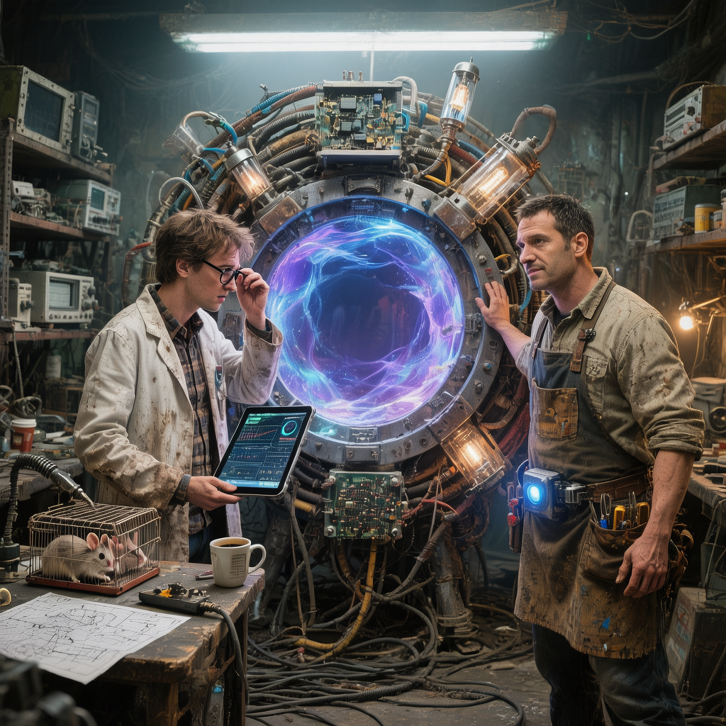 В лаборатории, больше похожей на склад хлама после научного апокалипсиса, пахло озоном, припоем и надеждой. Максим, дотошный теоретик с вечно спадающими очками, и Артём, гений-практик с золотыми руками, стояли перед сердцем своего творения — квантово-полевым рекомбинатором, или просто «Порталом». Сначала исчезали и возвращались чашки, потом — лабораторные мыши по кличке Тесла и Эйнштейн. Все логировалось, все работало. Автовозвращатель — пояс-маяк, привязанный к «якорю» в лаборатории — был их страховочным тросом.