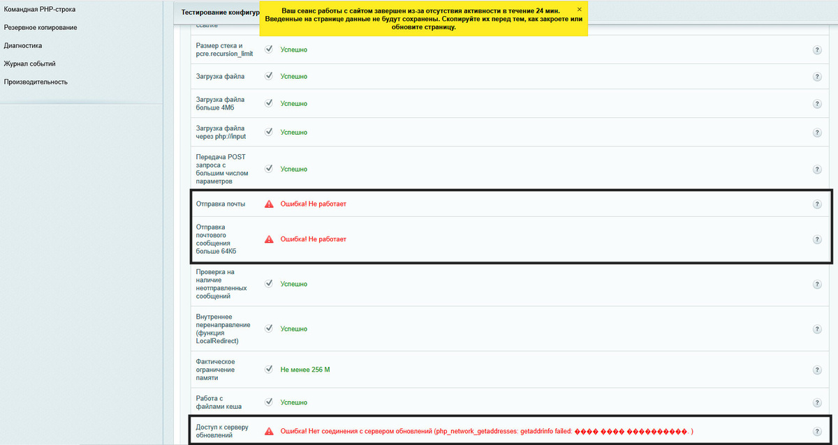 Проверяются критические значения параметров, определяемых в файле настроек php.ini. В случае ошибки выводится список параметров, которые настроены неправильно. Подробную информацию по каждому параметру можно найти на сайте php.net.