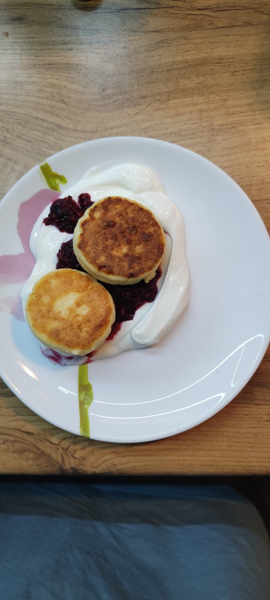 Завтрак выходного дня: сырники, сметана, ягоды замороженные перетертые, +1 за кадром