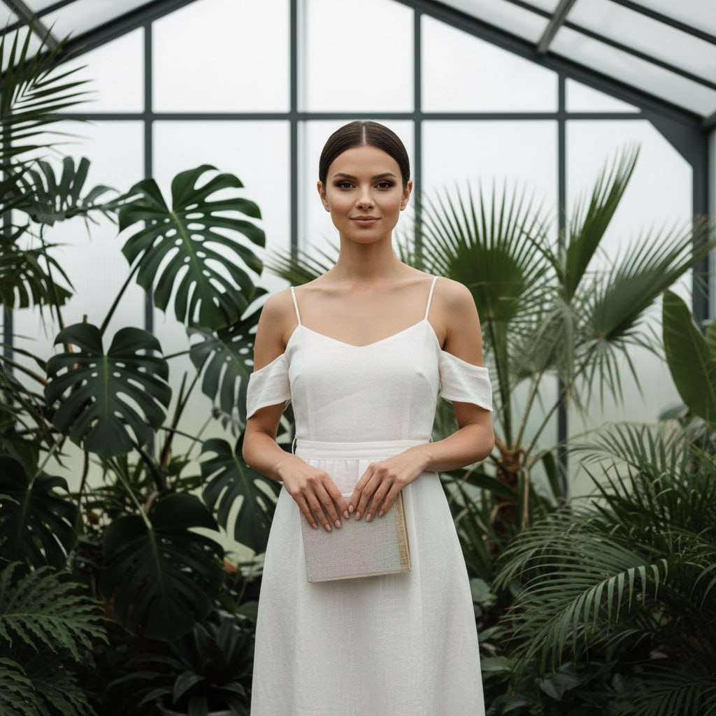 🔥 Добавили ту самую деталь, которой не хватало для полного образа. Теперь в кадре есть предмет в руках, который делает позу естественнее, а сам снимок — еще дороже. Твое селфи + этот промпт = идеальный контент для ленты в стиле «тихого люкса». ⚡️ Используя загруженное селфи как точный референс лица с полным сохранением всех черт и идентичности на 100%, создай фотографию по описанию, сохраняя абсолютное сходство лица. Эстетичный [редакционный портрет] женщины в [современной минималистичной оранжерее]. Она [спокойно стоит и смотрит прямо в камеру с легкой, едва заметной полуулыбкой]. В руках [держит небольшую винтажную книгу в тканевом переплете пастельного цвета]. Одета в [льняное платье-миди молочного цвета с открытыми плечами, тонкими завязками и акцентом на талии]. Вокруг [крупные листья монстеры и тропические пальмы]. [Мягкий рассеянный дневной свет] создает ровный тон кожи и мягкие блики. [Крупный план, ракурс прямо перед собой]. Кристально чистая картинка, фотореалистично, 8K,