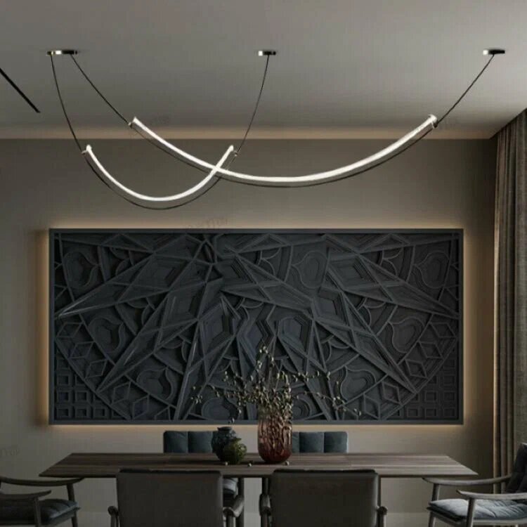 Если стол длинный, хорошо работают вытянутые светильники. Например, Люстра SIUU, светодиодная, 75Вт, 150см,черный художественный креативный светильник длиной 150 см - отличный вариант для прямоугольных столов. Он равномерно освещает поверхность и визуально подчёркивает геометрию.