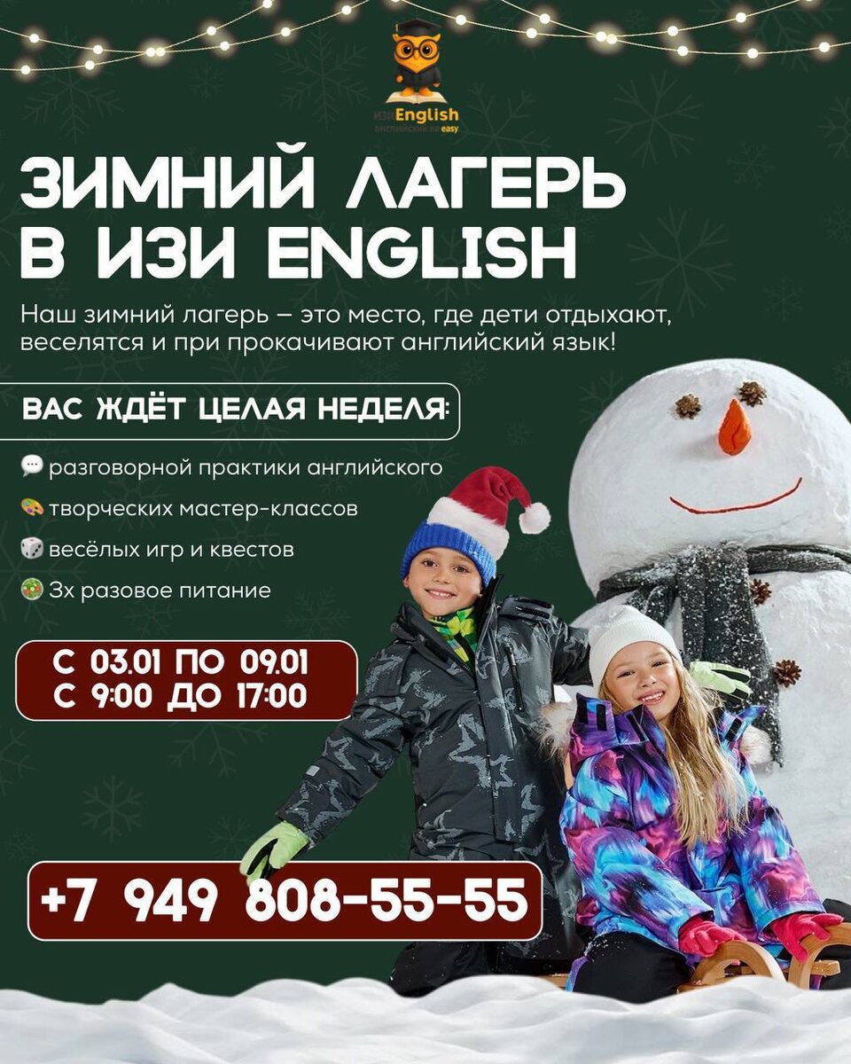 ⚠️ ❄️ Зимний лагерь для детей 2026 ⛄️ «Страна Зималия» 📅 3–9 января 2026 🕘 9:00–17:00 🍽 3-разовое питание 👧👦 Группа до 10 детей 📍 Донецк — пр. Ильича, 3 (4 этаж) 📍 Макеевка — пл. Советская, 2 (2 этаж) Мы берём на себя 7 дней каникул вашего ребёнка: ❄️ игры и квесты 🎨 творчество 🧩 командные задания 🚶♂️ прогулки и экскурсии ⸻ 💰 Стоимость участия: 🔥 19 900 ₽ — при полной оплате до 29 декабря После — 24 900 ₽ или мест уже не будет. 📲 Запись прямо сейчас: 👉 @easy_english_admin 📞 +7 949 808-55-55 📢 https://t.me/english_university_dn Если вы откладывали решение — сейчас именно тот момент.