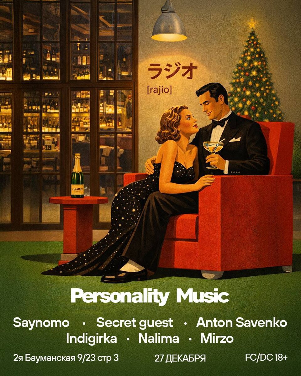 27 декабря в преддверии Нового Года мы собираемся на Personality Music в «Radio» на Суперметалле, чтобы красиво закрыть уходящий год под сеты наших диджеев и провести вечер среди друзей, музыки и теплой атмосферы. Берите с собой предвкушение праздника — мы сделаем всё, чтобы эта ночь запомнилась ощущением предстоящего новогоднего чуда. SAYNOMO SECRET GUEST ANTON SAVENKO INDIGIRKA NALIMA MIRZO 🎫 Билеты FC/DC 18+ 📆 27 декабря 📍 Радио на Суперметалле, 2-я Бауманская ул., 9/23с3, Москва