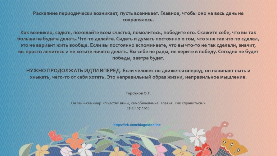 Главное, чтобы оно на весь день не сохранялось. Как возникло, сядьте, пожелайте всем счастья, помолитесь, победите его. Скажите себе, что вы так больше не будете делать. Что-то делайте. Сидеть и думать постоянно о том, что я не так что-то сделал, это не вариант жить вообще. Если вы постоянно вспоминаете, что вы что-то не так сделали, значит, вы просто ленитесь и не хотите ничего делать. Вы себе не рады, не верите в победу. Сегодня не будет победы, завтра будет. НУЖНО ПРОДОЛЖАТЬ ИДТИ ВПЕРЕД. Если человек не движется вперед, он начинает ныть и хныкать, чего-то от себя хотеть. Это неправильный образ жизни, неправильное мышление.