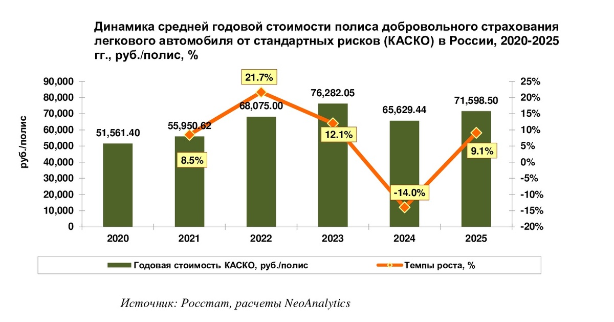 В ходе ежемесячного мониторинга розничной (потребительской) годовой стоимости полиса добровольного страхования легкового автомобиля от стандартных рисков (КАСКО), проведенного NeoAnalytics, выяснилось, что в 2025 г. средняя стоимость за полис выросла на 9,1% в отношении аналогичного показателя годом ранее и составила 71 599 руб. за полис. Годом ранее средняя цена полиса за год существенно упала. Пик стоимости пришелся на 2023 г. Под стоимостью полиса КАСКО подразумевается годовая стоимость полиса добровольного страхования легкового автомобиля от стандартных рисков - полное КАСКО (в случае хищения, повреждения, в результате дорожно-транспортного происшествия, пожара, стихийного бедствия, действия третьих лиц). Условия страхования: новый легковой автомобиль средней ценовой категории (год выпуска автомобиля не ранее 2 лет предшествующих отчетному году, условная заявленная стоимость 1,0-4,0 млн. руб.) мощностью двигателя до 150 л.с., возраст водителя - 30-40 лет, водительский стаж - не мен