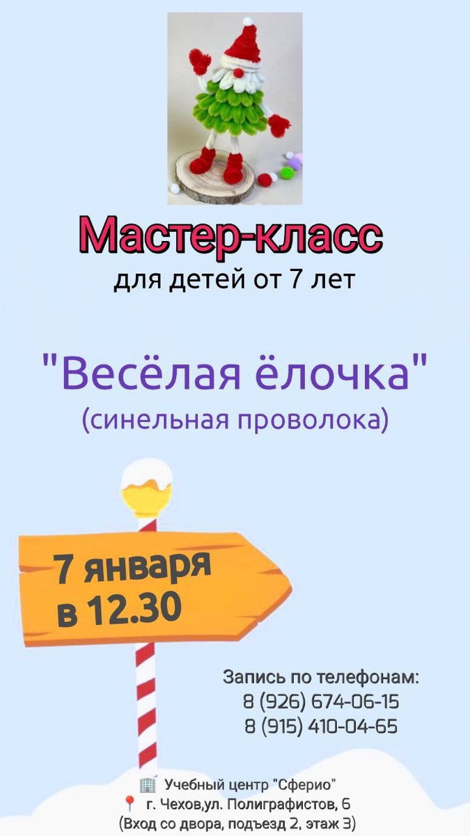✨ 🎄✨ МАСТЕР-КЛАСС "ВЕСЕЛАЯ ЕЛОЧКА" из синельной проволоки✨🎄 😍 Что особенно нравится детям: 🎄 Мягкая, яркая синельная проволока — легко и интересно работать 🎨 Свобода фантазии: каждая ёлочка уникальна ✨ Украшения, глазки, блёстки — настоящий праздник творчества 🎁 Готовая ёлочка станет украшением для дома или подарком для близких 🎁 🚫 Возраст: 7+ 📆 07.01.2026 🕛 12:30 🏢 Учебный центр "Сферио" 📍 г. Чехов,ул. Полиграфистов, 6 (Вход со двора, подъезд 2, этаж 3) 🔗 Записаться: https://t.me/UZentrSferio2024 Наши соцсети 📲⬇️ ➡️ ВК https://vk.com/sferio_kids ➡️ ТГ https://dzen.ru/id/672e115c65592e5989376c34 ➡️ Продленка https://vk.com/prodlenkachehov ➡️ Школа https://vk.com/sferio_school 🎁Забрать подарок:🎁 https://t.me/bot_sferio_bot 💥 Подпишись и получи подарок 💥 Наша What'sApp группа