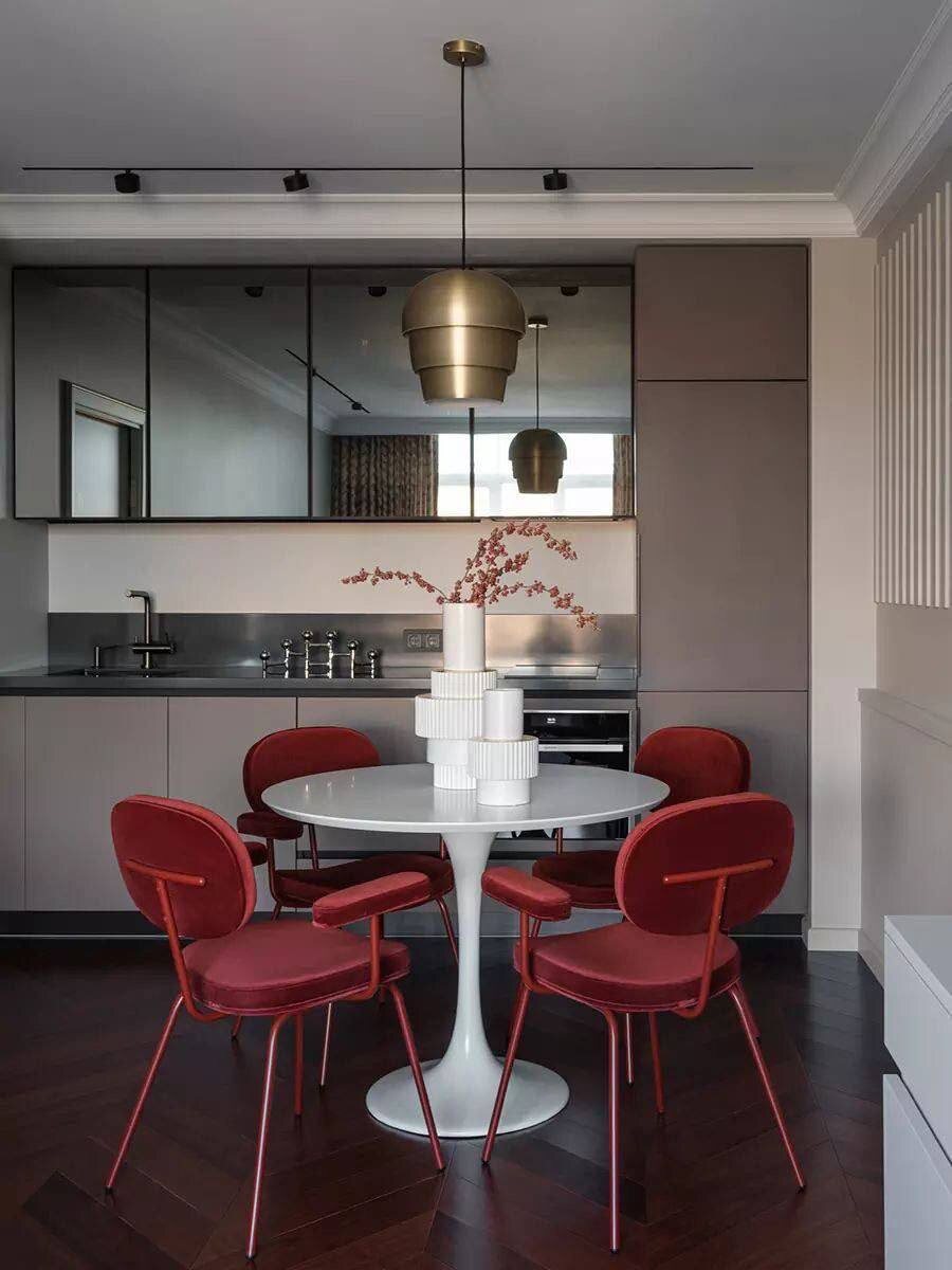 Ретро и винтаж Старинные витрины, комоды и хрустальные элементы. Цвет Глубокие природные оттенки, терракотовый, зеленый и бордовый. Интеграция технологий «Умные» дома становятся нормой, меняя наш подход к быту. Текстуры Многослойность и выразительные фактуры будут актуальны как в оформлении окон, так и в интерьере в целом. Акцентные потолки Цвет и графика на потолках создадут уникальные акценты в пространстве. Шпон и рифленые стекла Яркие и контрастные деревянные дизайны, а также перегородки с рифлеными стеклами. Симметрия Возвращение гармонии в пространство. Свет Ременные системы освещения, позволяющие менять восприятие пространства. Торшеры и лампы также остаются в тренде. Зеркала Зеркала находят новое применение в отделке кухни, подчеркивая легкость и воздушность образа. Радиусы Вместо массивной округлой мебели приходят изящные, плавные, но вытянутые формы и радиусные стены для мягкости линий и текучей геометрии.