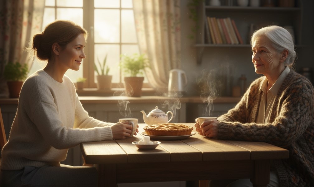 Проходи, дорогая, присаживайся вот сюда, к батарее — согреешься. У меня как раз шарлотка в духовке доходит, запах на весь подъезд стоит. Налить тебе чаю с лимоном или, может, кофе с молоком? Давай пока просто посидим минутку в тишине, выдохнем этот суматошный день.