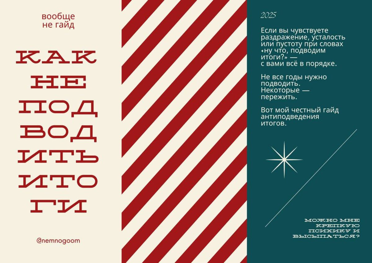 Но только не те итоги, в которых ты снова «недо». Такие итоге нам не подходят. А теперь ныряйте по ссылке, чтобы найти гайд — какие 3 шага НЕ НУЖНО делать при подведении итогов и 5 вопросов, чтобы быть честнее с собой. Хотите чего-то нового в жизни? Придется делать по-новому. Я могу только подсказать вектор 🎄