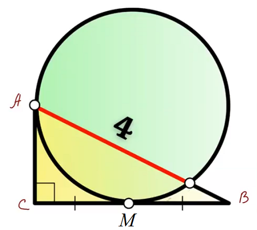 Рассмотрим решение задачи, которая на канале Валерия Казакова решена с использованием дополнительного построения, теоремы Пифагора и выражения радиуса окружности через радикал. Задача дана под заголовком «Школьная олимпиада! Окружность касается катетов». Итак, задача. 1. Дан прямоугольный треугольник ABC, окружность касается его катетов — в вершине A и в середине M отрезка BC. Окружность пересекает гипотенузу в точке K, AK = 4. Найдите площадь треугольника ABC. Заключительный кадр решения выглядит так. Источник. Школьная олимпиада! Окружность касается катетов | Наглядная Геометрия | Дзен https://dzen.ru/video/watch/694e46d006be3927b8e5b4f9 Задача решена довольно просто с применением теоремы Пифагора, без которой можно было обойтись. Решим задачу без теоремы Пифагора и выражения радиуса окружности через радикал. Решение. Воспользуемся рисунком Валерия Казакова, хотя для его решения не требовалось строить квадрат, описанный около окружности. Прямоугольные треугольники ADK, DBK и ABC под