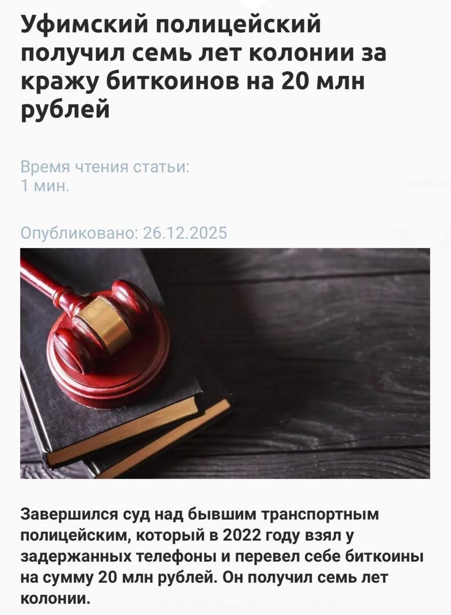 Сотрудник транспортной полиции в Уфе получил семилетний тюремный срок за кражу биткойнов на сумму 20 миллионов рублей и обязан выплатить