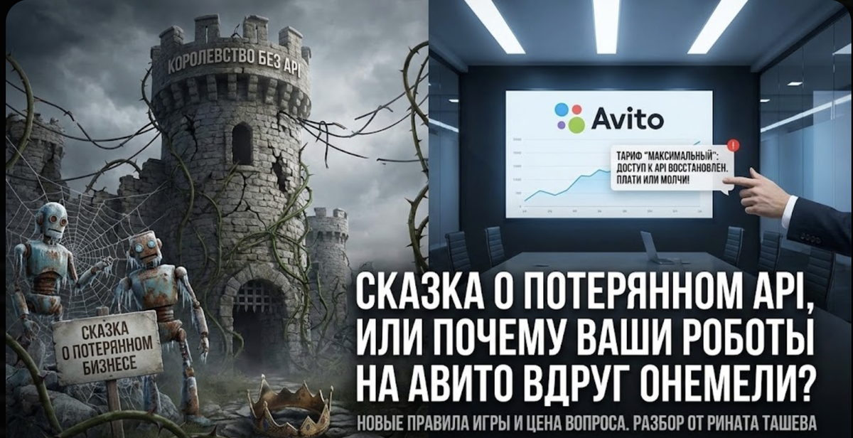Жили-были в славном цифровом королевстве Авито мастера разные: сантехники, бьюти-феи, грузчики могучие и «мужем на час» именуемые. Жили они не тужили, платили Королю Авито за просмотры своих объявлений, а общались с клиентами не сами, а через волшебных помощников — CRM-системы. И была у них волшебная нить (API), которая связывала их объявления с их умными программами. Клиент пишет: "Хочу ноготочки!", а робот ему сам отвечает, записывает и смайлик шлет. Красота! И было это доступно даже на самом простом, крестьянском тарифе. Но однажды, в темный день декабря, небо над Авито потемнело. Король (Алгоритм Великий) издал указ, от которого у тысяч предпринимателей отвалилась… интеграция. Цитата из Указа (скриншота):