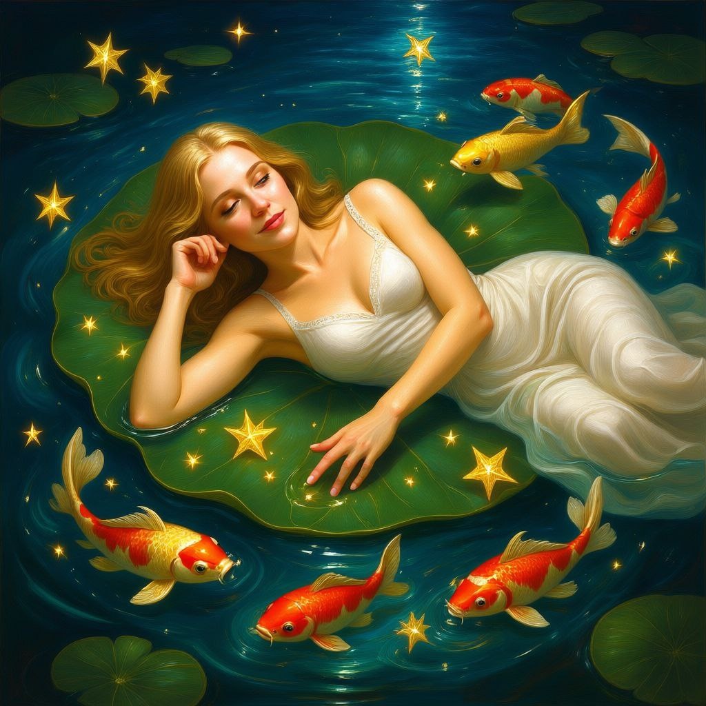 Лицо женьщины не изменяй, оставь в точности как на эталонном фото.Красивая блондинка лежит на листе лотоса в воде, касаясь пальцем окружающих её золотых рыбок. Её окружают сияющие звёзды, картина выполнена в стиле Эдварда Роберта Хьюза, в технике масляной живописи с элементами ар-деко, на ней изображены карпы кои и белое платье. Магическое чувство, атмосфера Гарри Поттера, свечение, превращение рыбок в украшения 👉Тут БОТЫ 👉канал в Дзен 💰Donate