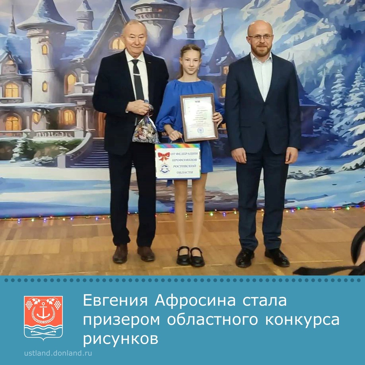 регионального конкурса детского рисунка «Охрана труда глазами детей». 🎨Из более чем 900 представленных работ юных художников в возрасте от 6 до 12 лет были отобраны лучшие. 🎉В возрастной категории от 10 до 12 лет призером конкурса среди учащихся общеобразовательных организаций стала Афросина Евгения Андреевна, ученица 5 класса Пухляковской школы им. А.В. Калинина. 🎁Заместитель министра труда и социального развития региона Андрей Харахашян наградил победителей и призеров конкурса грамотами и благодарственными письмами, а председатель Федерации профсоюзов Ростовской области Александр Лозыченко вручил ребятам наборы юных художников и новогодние подарки. #УстьДонецкийрайон #АдминистрацияУстьДонецкогорайона