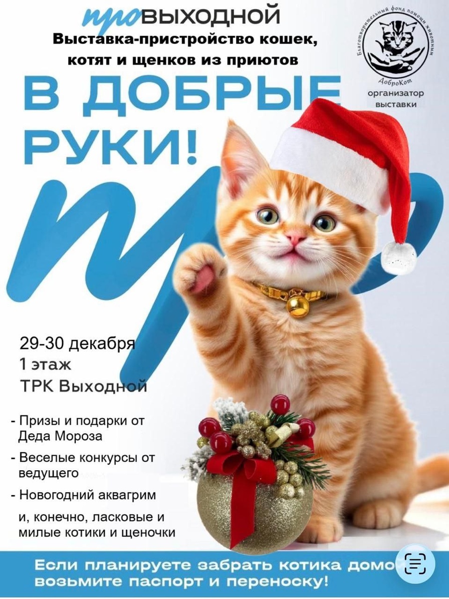 ». 🙌 Организаторы мероприятия – благотворительный фонд «ДоброКот». Все питомцы спасены с улицы, обработаны от паразитов, ухожены, здоровы, красивы, умны, готовы ехать домой. 🧘♀ Если вы планируете выбрать питомца, не забудьте с собой паспорт и переноску. Если же пока не готовы обзавестись пушистым другом, можете просто прийти полюбоваться на милых малышей и принести для них вкусные подарки. Приютам всегда необходимы: корма (сухие и влажные), игрушки, медикаменты, препараты от паразитов. 🎅 Также на выставке всех пришедших будет ждать поздравление от Деда Мороза, интересные конкурсы, новогодний аквагрим. Все собранные средства пойдут на помощь животным из приютов. 📍 Выставка пройдёт на первом этаже ТРК «Выходной» (г. Люберцы, Октябрьский проспект, д.112) с 14.00 до 20.00. Приглашаются все желающие! 🌲🌲 ✅ Присоединяйся к каналу в MAX #Люберцы @VM_Volkov