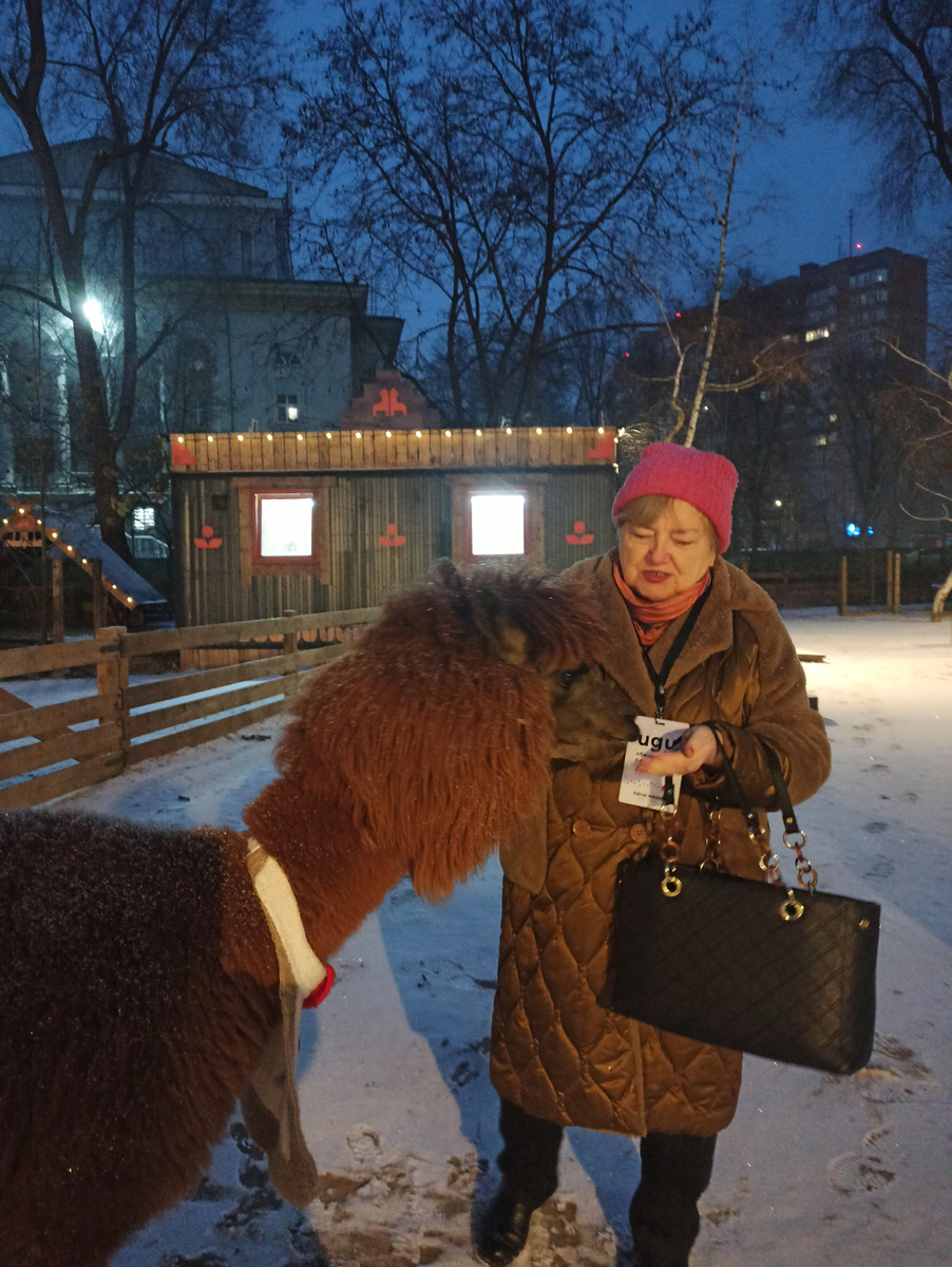 Мы с внуком давно собирались посетить то место в нашем городе, где живут альпаки. Это домашние южноамериканские верблюды, отличающиеся очень мягкой и теплой шерстью, которую ценят по всему миру. А в Ростове они живут в парке "Пача Мама". Там их 22 особи разных возрастов. Туда мы и поехали. Альпаки .были принаряжены к Новому году и выглядели очень празднично. Их вожак по кличке Юлиан был в белой манишке и с красной бабочкой. 26 декабря впервые пошел снег, и обстановка в вольерах была новогодняя. Эти дружелюбные животные обожают морковь, и мы кормили их, не успевая пополнять свои запасы. Нас предупредили, что 30 минут мы проведем с альпаками, 15 минут - с козочками и 15 минут - с кроликами. Половина альпак находилась в теплом загоне, а другая половина общалась с посетителями. Особенно трогательно выглядят малыши, но им морковка не полагается, да они и не настаивали. Часть животных пряталась в шалаше. Внешне альпака напоминает необычную овцу или маленького верблюда. Но сходство с пос