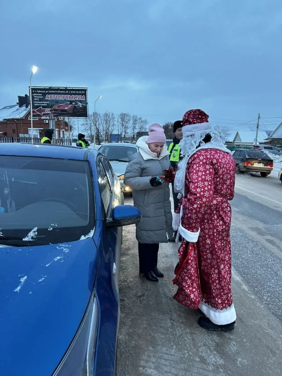 Сегодня в Туймазах сотрудники ДПС останавливали автомобили. Однако не с целью проверки документов водителей, а чтобы поздравить их с наступающим новым годом, сообщили в госавтоинспекции города. Вместе с полицейскими в акции приняли участие Дед Мороз и Снегурочка. Они дарили сладкие подарки, календари и памятку о действиях при звонке мошенников. Не пропускали они и пешеходов — дарили им такой же набор. Водителям и пешеходам пожелали безопасного года и благополучия, а они в свою очередь искренне благодарили правоохранителей за такой сюрприз и праздничное настроение. Акция «Полицейский Дед Мороз» проходит в Туймазах ежегодно. В нынешнем году роли сказочных персонажей исполнили инспектор управления образования Альбина Халиуллина и инспектор отделения ДПС, младший лейтенант полиции Рустам Таминдаров. Ранее «Башинформ» сообщил об открытии в Уфе резиденции Деда Мороза. Их в столице теперь две.