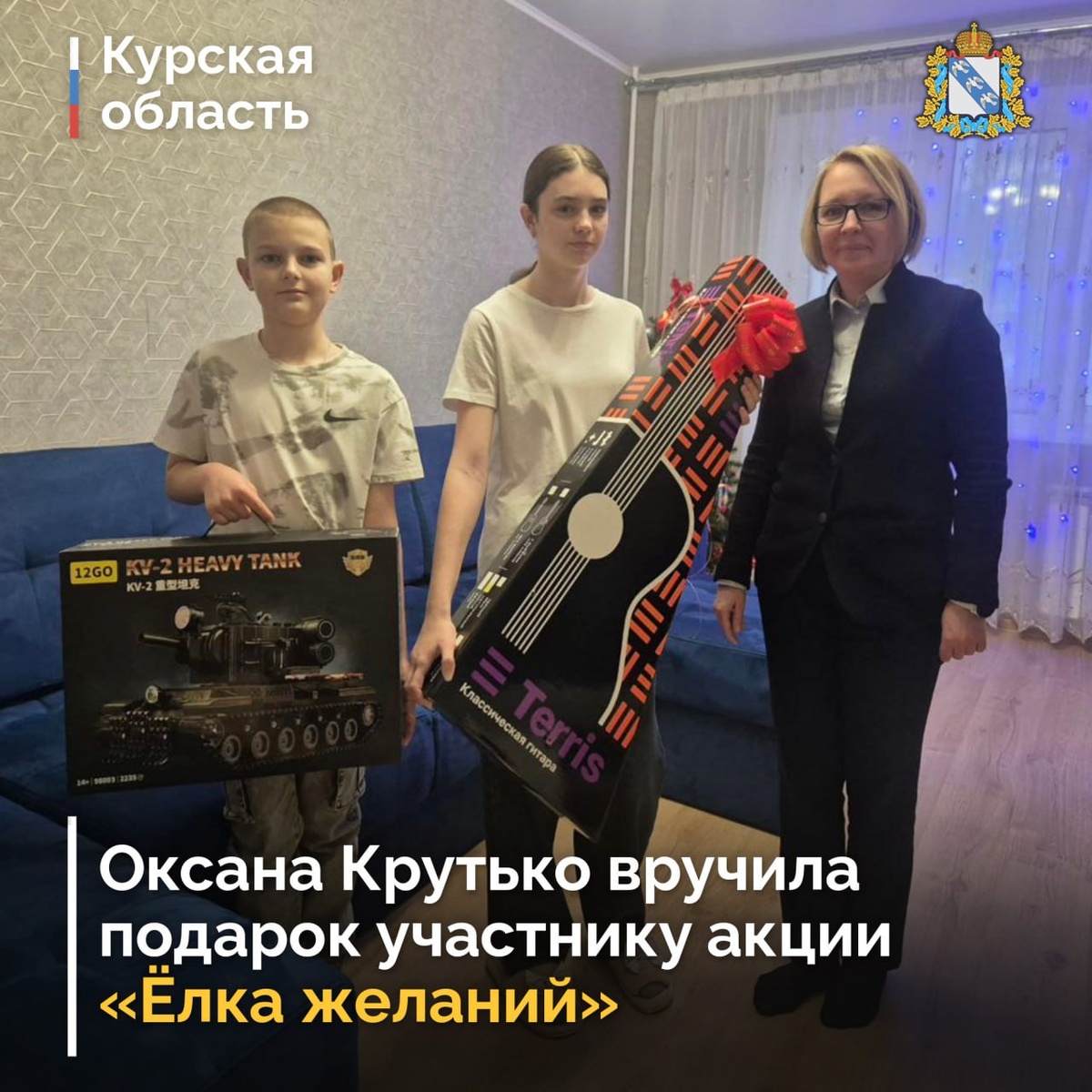 Курские чиновники продолжают исполнять мечты с «Елки желаний». Так, заместитель губернатора Курской области Оксана Крутько подарила 11-летнему Артему конструктор. Именно о нем мечтал мальчик, когда писал на открытке. Мальчик из Глушковского района. Его семья после трагических событий августа прошлого года переехала в Курск. Старшая сестра Артема мечтала о гитаре. Даша не участвовала в новогодней акции, но Крутько узнала о желании девочки. Теперь гитара есть. Оксана Крутько исполнит мечту пятилетнего Глеба из Курчатовского района, подарив ему велосипед.