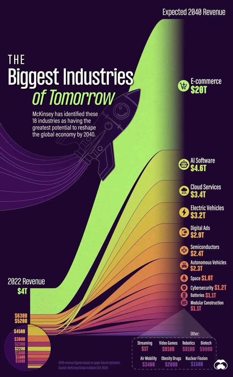 На днях попалась на глаза инфографика на основе прогноза McKinsey Global Institute по оценке потенциала некоторых рынков к 2040 году. Абстрагируюсь от самих оценок потенциала роста тех или иных рынков. Вместо этого поделюсь другими соображениями ниже. 1️⃣ Самым горячим темам на сегодня «рисуют» самый большой рост завтра. ИИ-софт должен, возможно, показать рост в 54 раза (с $85 млрд до $4,6 трлн). А облачные сервисы, согласно прогнозу, могут вырасти в 15 раз (с $220 млрд до $3,4 трлн). Удивительно, что такая недавно горячая тема, как VR, вообще отсутствует в ТОПе. 🤔 2️⃣ Ещё в 5 раз предположительно вырастет индустрия e-commerce. Интересно, что, по мнению аналитиков, закладывается в качестве драйвера роста? Дальнейший переход офлайн-покупок в онлайн или рост e-commerce в регионах с низкой долей онлайн-покупок сейчас? 3️⃣ На инфографике представлены 18 индустрий. Осторожно предположу, что ещё минимум 2–3 индустрии, которые «выстрелят», аналитики «пропустили». Будущего всё-таки никто не з