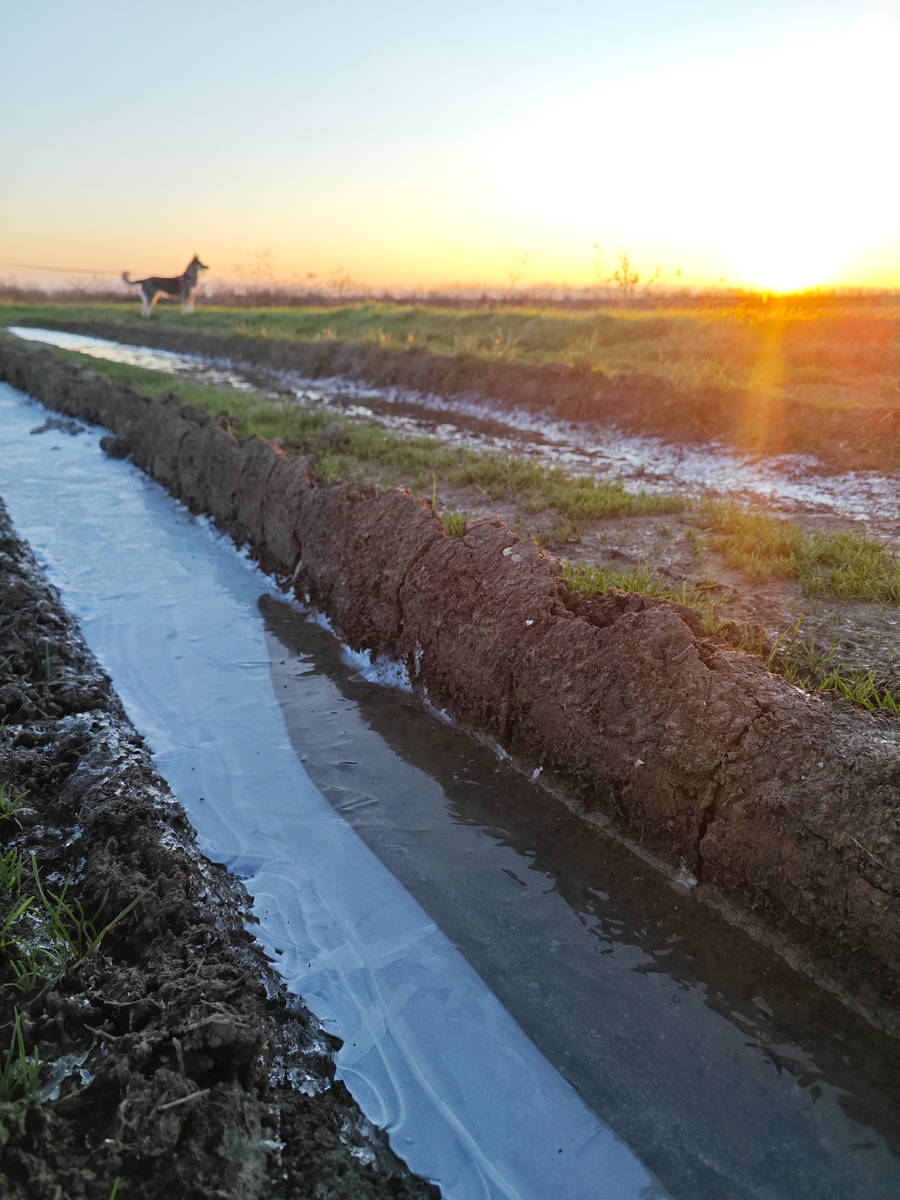 На рисовых полях снежок тонким слоем прикрыл дороги.