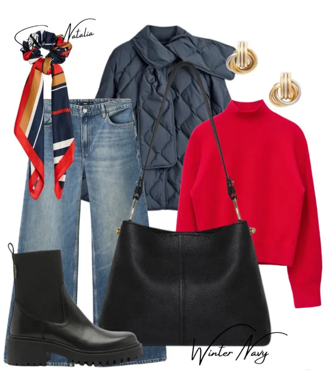 Этот комплект строится на очень выигрышной формуле: спокойная база и один сильный цвет, который делает настроение. Стёганая куртка в оттенке глубокого navy задаёт зимнюю собранность и выглядит по-европейски сдержанно — как хороший гардероб без лишних слов. На её фоне ярко-красный свитер работает как «румянец» образа: добавляет энергии, подчёркивает лицо и сразу делает комплект заметнее, но не кричащим.
