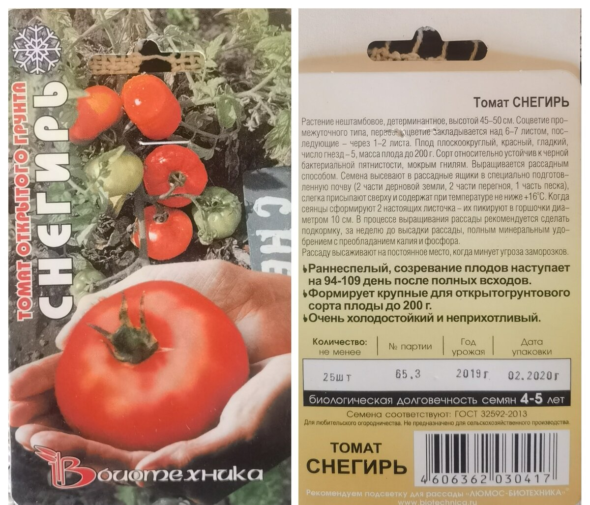 Одним из первых каналов, которые я начинала смотреть на заре своего самостоятельного огородничества был ВогородеПРО. Мне нравились их результаты урожайности и было интересно попробовать нечто подобное. По этой причине первыми сортами/гибридами, которые я когда-то купила были те же самые, которые выращивала хозяйка канала ВогородеПРО. Это были Этюд (типа гибрид, но расщепления не дает), Дина (заявлена как низкий дет, но в реалиях высокорослая), черри Медовая Капля (она так и лежит, я ее не вырастила) и детерминантный сорт от Биотехники Снегирь. Вот его-то я впервые вырастила только в этом году, хотя уже пыталась. Пачка вот такая: