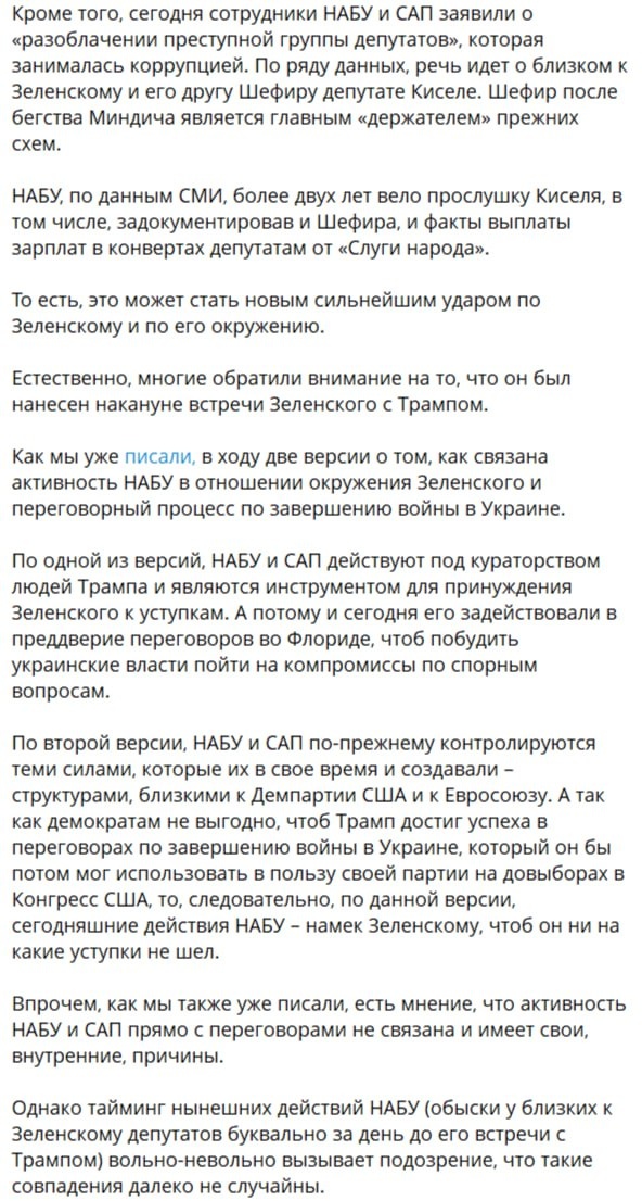 У меня в прогнозе на 2025 год было написано следующее: Поэтому выход США из конфликта на Украине уже решенный вопрос, а Владимир Зеленский для «команды Трампа» — политический труп. Тут вопрос стоит лишь в сроках. Учитывая вышеописанный подход «команды Трампа» к Владимиру Зеленскому, можно с большой степенью вероятности спрогнозировать, что он либо будет заменен на должности в результате перевыборов в 2025 году, которые по законодательству возможны осенью, либо уйдет в «политическую тень», предоставив возможность вести переговоры другим лицам. Трамп в феврале обзывал Зеленского «диктатором без выборов» с низким рейтингом одобрений, но тогда этим и закончилось. На второй день операции «Мидас» антикоррупционных органов Украины я писал: ...это не эпизод, а скоординированная кампания по дискредитации Зеленского, согласованная с США и невыгодная европейцам. Да, мой прогноз в части «политического отхода» Зеленского не оправдался в 2025 году, но я не отказываюсь от своей логики развития со