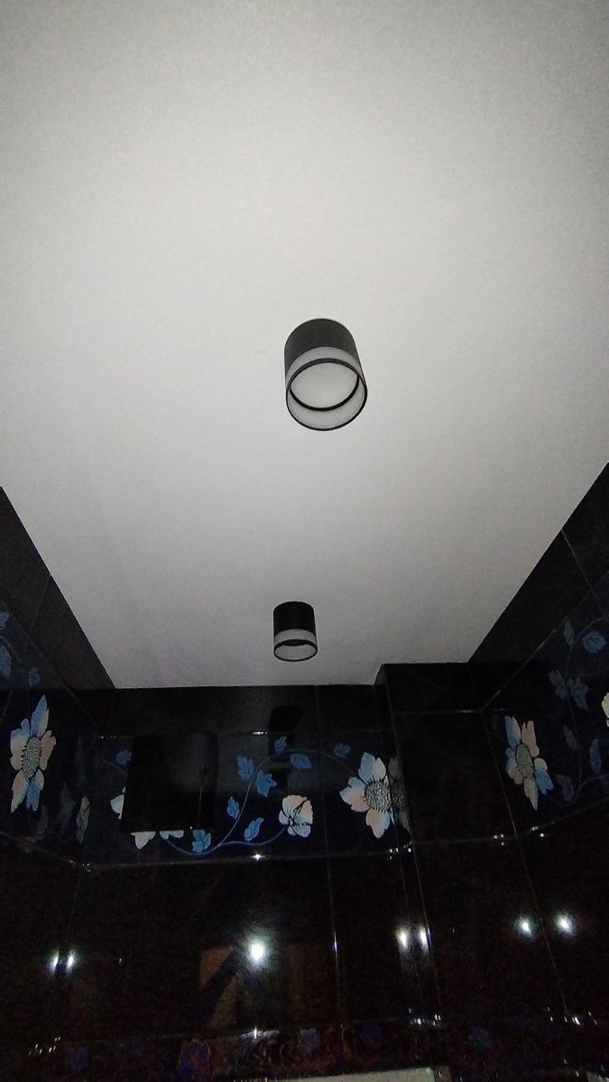 Бесщелевая система (потолок плотно примыкает к стене), матовый натяжной потолок Bauf 270 и 2 внешних точечных светильника