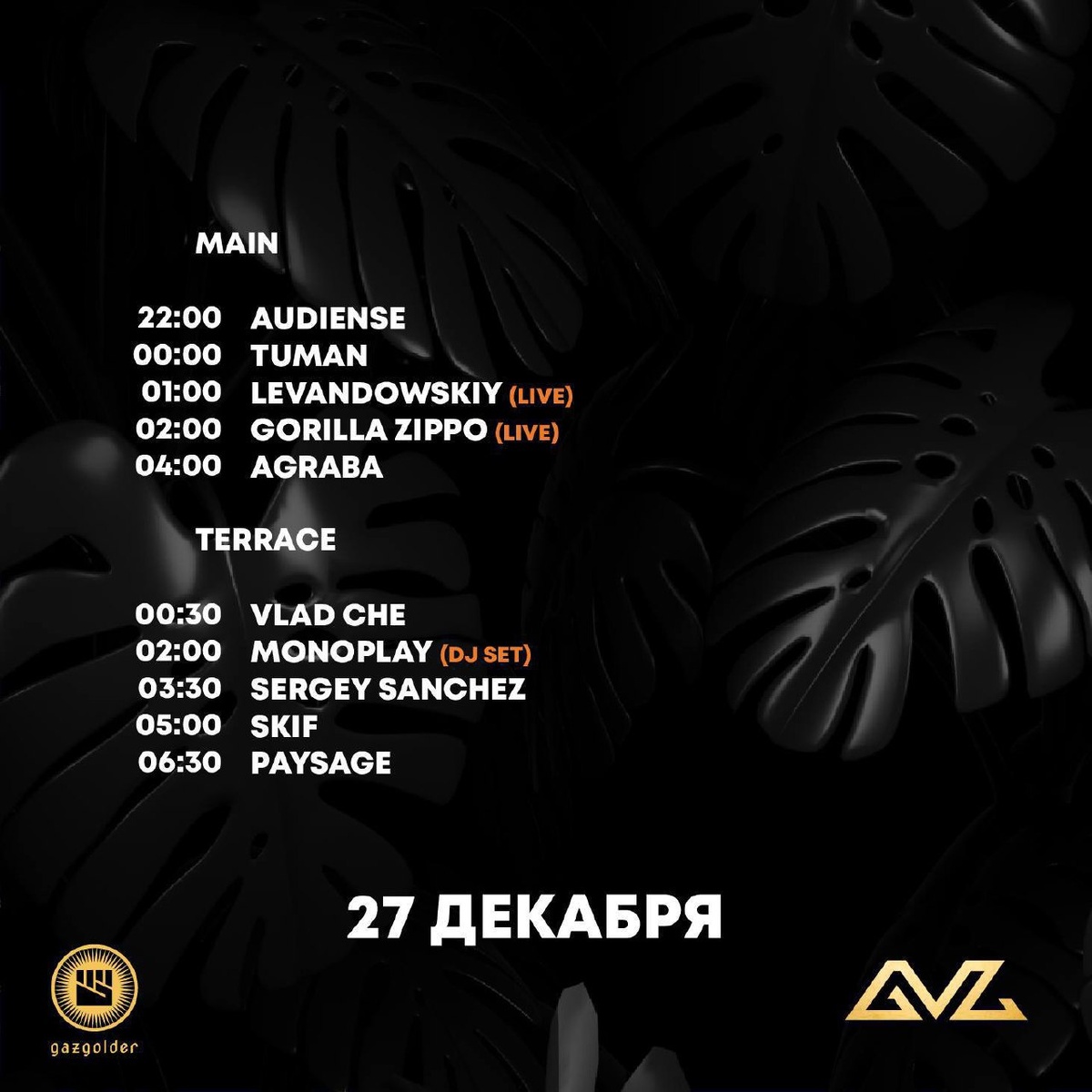 27 декабря В эту субботу Gazgolder Club собирает друзей. Прощаемся с легендарным Gazgolder club вместе с Gorilla Zippo & friends. Также в эту ночь с нами: Levandowskiy (live), Agraba, Audiense, Monoplay (dj set), Paysage, Sergey Sanchez, Skif, Tuman, Vlad Che. 🎫 Билеты 📆 27 декабря, 23:00 📍 Gazgolder, Москва, Нижний Сусальный пер., 5, стр. 26