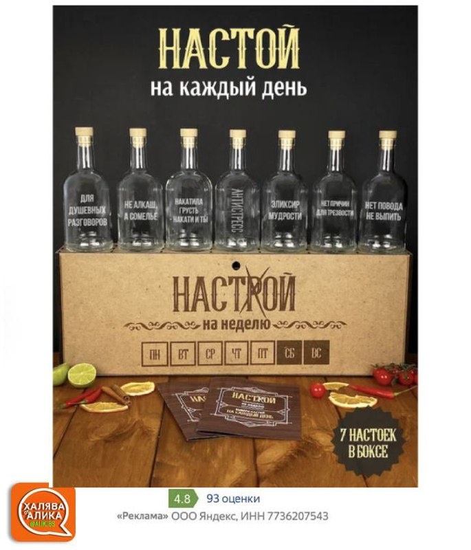 Автоматическая скидка 48% ЗАКАЗАТЬ В наборе 7 бутылок с готовыми смесями для настоек. Достаточно просто залить в них алкоголь. Бутылки упакованы в стильный ящик.