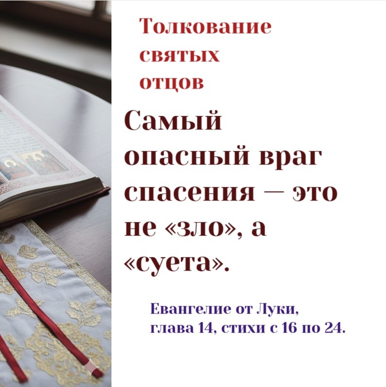 Это Евангелие (Лк. 14:16–24) — одно из самых глубоких и символичных. Святые отцы (особенно Григорий Двоеслов, Феофилакт Болгарский и Кирилл Александрийский) дают разбор каждой детали этой притчи. 1. Что такое «Большой Ужин»? (ст. 16) Святитель Григорий Двоеслов: Почему сказано «ужин» (вечеря), а не «обед»? Потому что обед бывает днем, а ужин — в конце дня. «Большой ужин» — это последние времена. Бог готовил спасение веками, и вот, в «вечер» истории мира, пришел Христос и зовет всех к Трапезе (в Церковь и к Причастию). Блаженный Феофилакт: Человек, устроивший ужин — это Бог Отец. «Раб», посланный звать — это Сын Божий, Иисус Христос, Который принял «зрак раба» и стал Человеком, чтобы лично пригласить нас. 2. Разбор «уважительных» причин (ст. 18–20) Святые отцы единогласно говорят: беда этих людей не в том, что они злодеи, а в том, что они привязались к земному. А. «Я купил землю» (Гордость и властолюбие) Святитель Григорий Двоеслов: Земля — это символ земной власти и гордости. Тот,