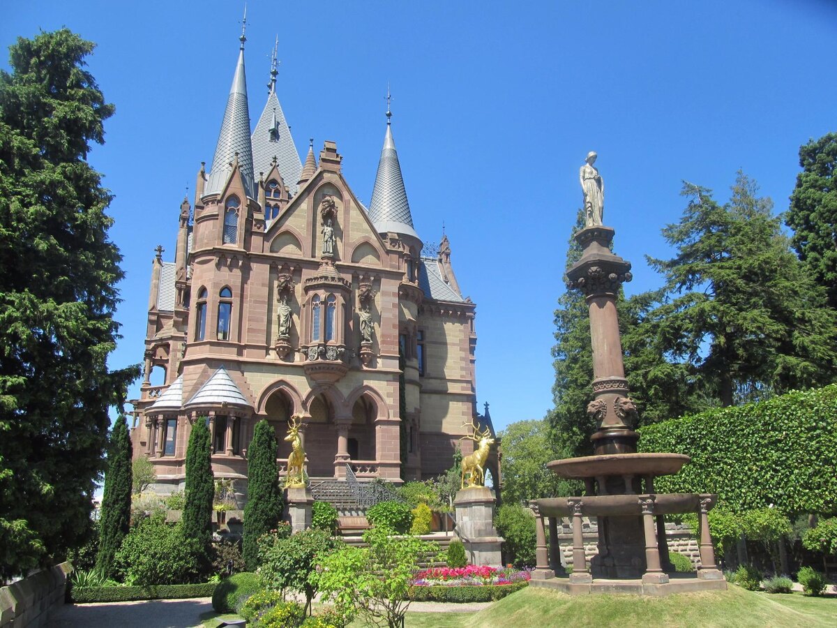 Знаете, путешествуя по Германии, особенно по Рейну, ожидаешь увидеть суровые, древние замки с небольшими комнатами и в средневековой серости. Но Драхенбург... Он стал полной неожиданностью и одним из самых ярких впечатлений моей поездки. В 10 километрах от Бонна расположился небольшой, уютный городой Кёнигсвинтер. Когда нам посоветовали съездить туда и посмотреть замок Драхенбург (Schloss Drachenburg — «Замок дракона»), я решил, что это будет очередной старинный замок. Но я ошибался. За окном проплывали виноградники, а потом, на высоком холме над городом Кёнигсвинтер, я его увидел. Это не крепость. Это скорее изящный дворец из сказки, с остроконечными башенками, резными балконами и флагами, развевающимися на ветру. Мне сразу сказали, что это не средневековое наследство, а «замок неоромантизма», построенный в конце 19 века для одного богатого биржевого маклера. То есть он родился из мечты о рыцарях и прекрасных дамах, а не из необходимости обороняться. Кстати, на соседней горе располож