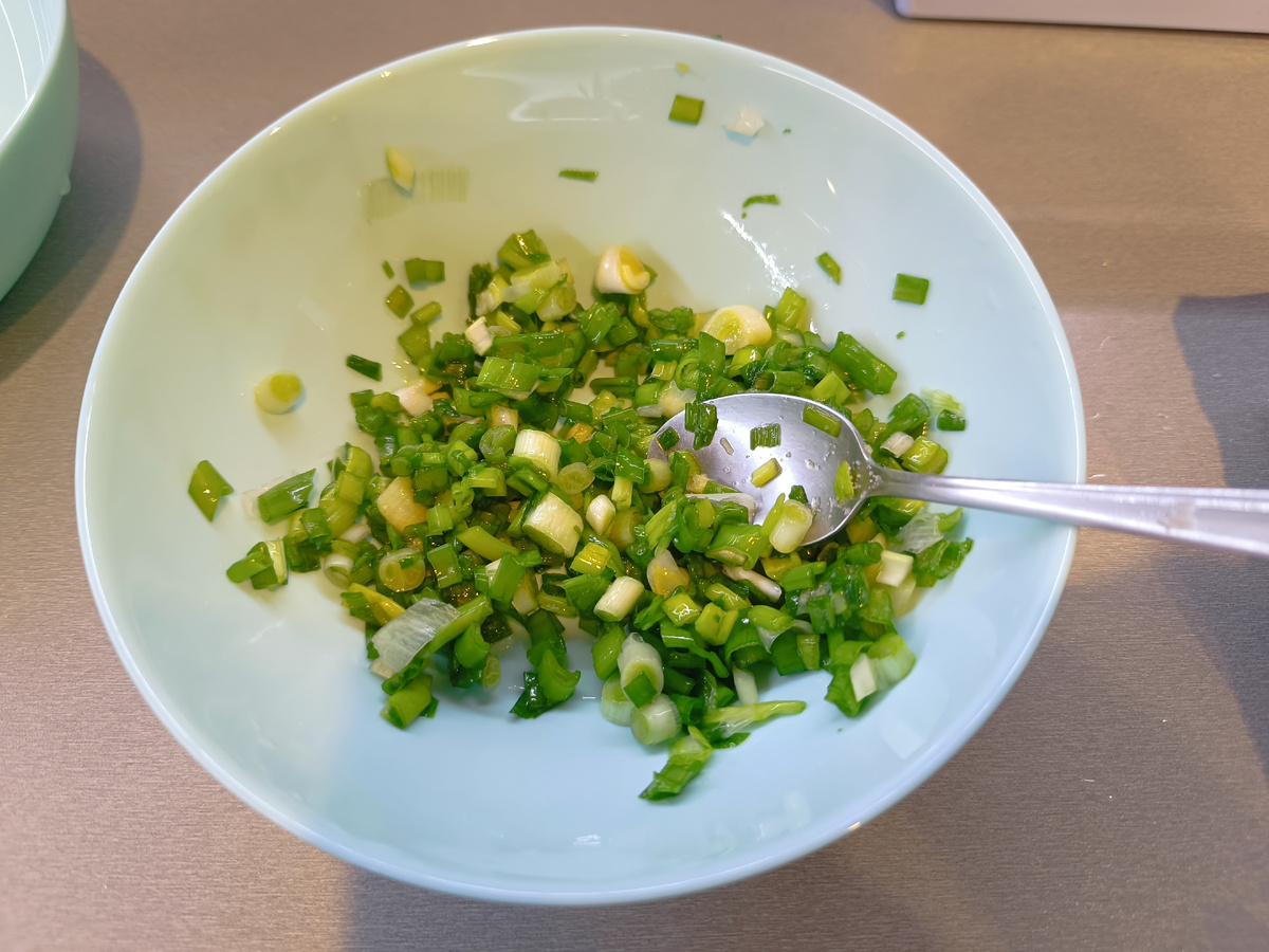 Для луковой начинки я использовала зелёный лук. Небольшой пучок нарезала, посолила, размыла ложкой.
