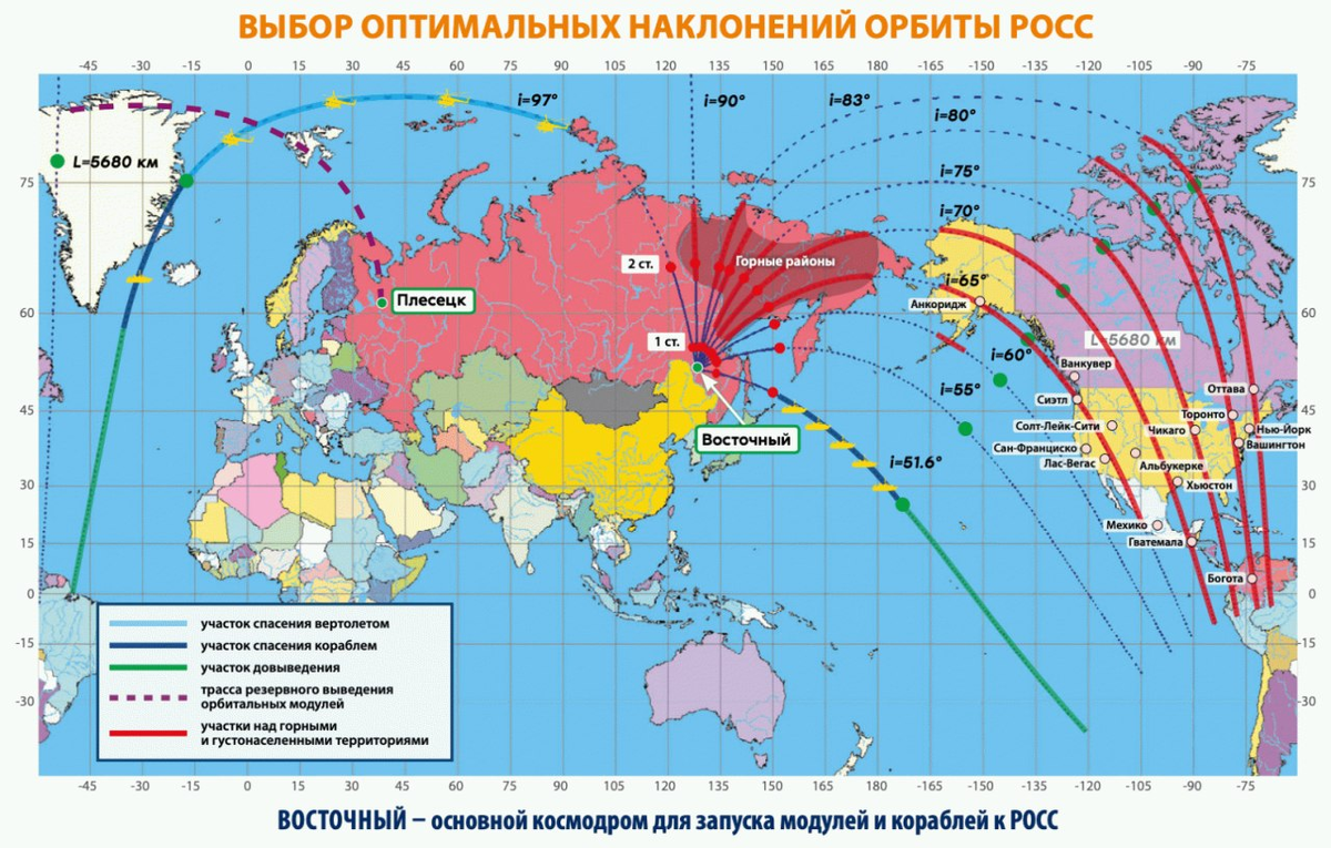 В далеком 2022 году я писала про проект новой Российской орбитальной станции (РОС или РОСС, служебной станции), которая в недалеком будущем должна заменить МКС. Проект был представлен в выпуске журнала «Русский космос». Среди прочего там было упомянуто, что постройка РОС начнется не ранее 2028 года на орбите высотой 372 км и наклонением 96.9°. Это был критически важный фактор, как тогда отмечалось. Солнечносинхронная орбита высотой 372 км от Земли и наклонением 96.9° (на первом этапе 334 км и 96.8°) обеспечивает постоянные благоприятные условия для наблюдения территории РФ. Также орбита позволяет отслеживать перемещение различных объектов и каждые полтора часа обозревать оба полюса Земли оптическими, инфракрасными, ультрафиолетовыми и другими детекторами, радиолокационными средствами. И тут стало известно, что РОС разместят на орбите 51,6°. Об этом ТАСС рассказал директор Института медико-биологических проблем РАН Олег Орлов, уточнив, что тема выбора орбиты РОС с углом наклонения 51,6
