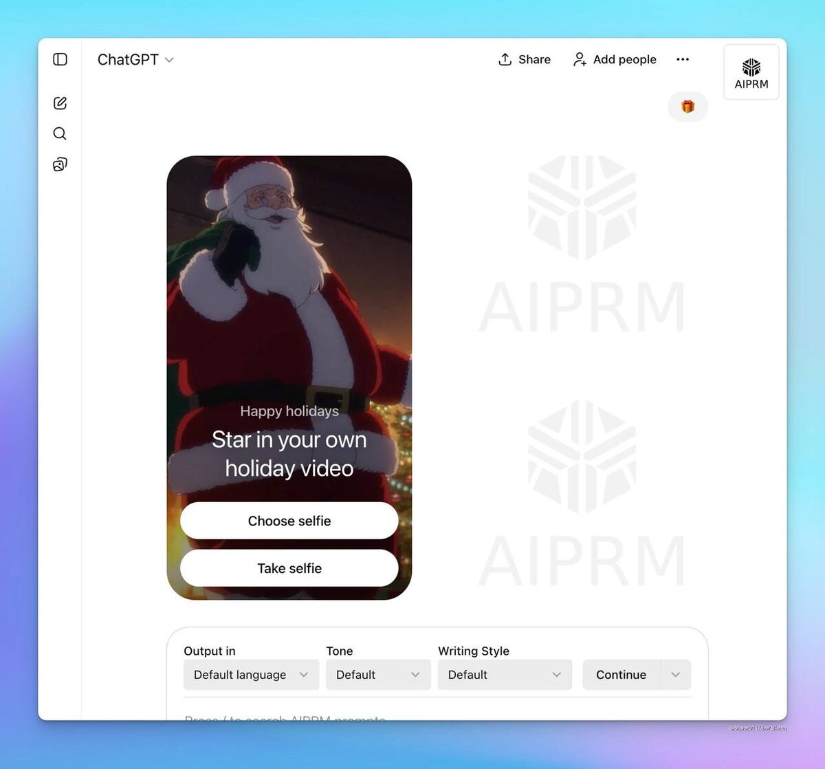 Отправьте эмодзи 🎁 в ChatGPT, приложение «Connector OpenAI Santa» использует новое приложение для создания вашего собственного праздничного видео с помощью Sora на основе вашего селфи. Скидывайте в чат, что у вас получилось. #новости@dailyprompts